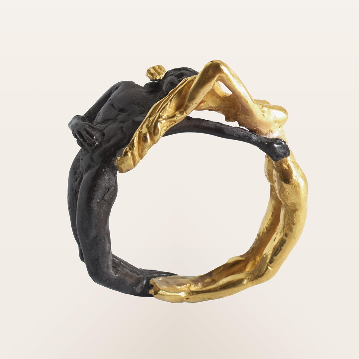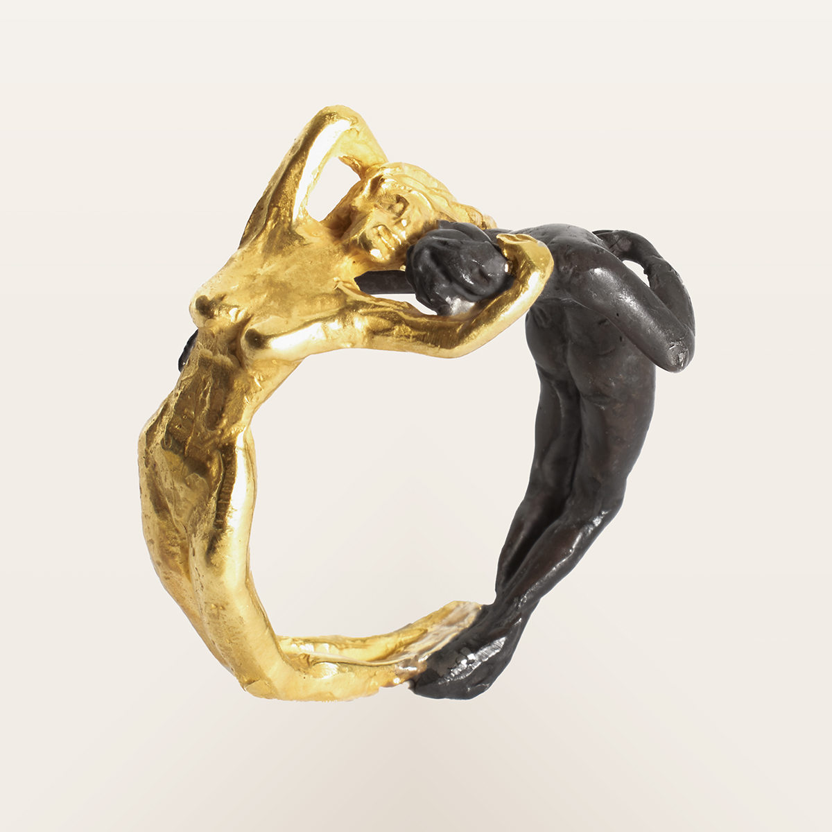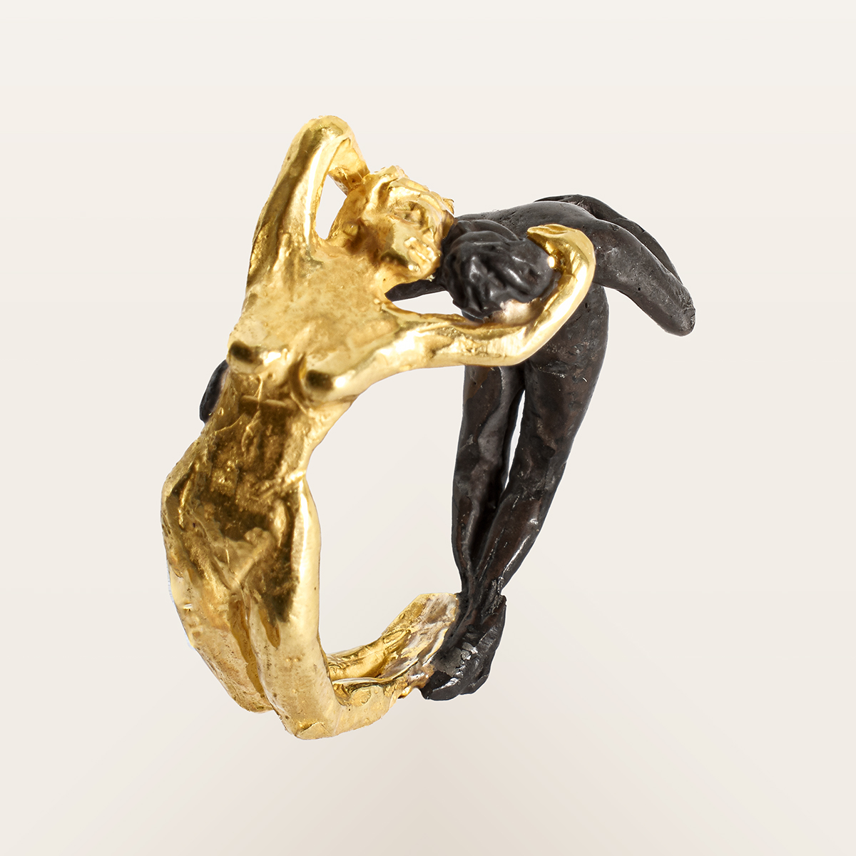 An eternal kiss, suspended between gold and silver that brush against each other without ever merging. This ring, a small sculpture to wear, captures the instant when two figures meet in a delicate embrace. A piece of jewelry that encapsulates the preciousness of a unique moment, to be experienced every day with elegance and meaning.