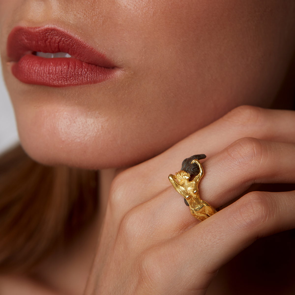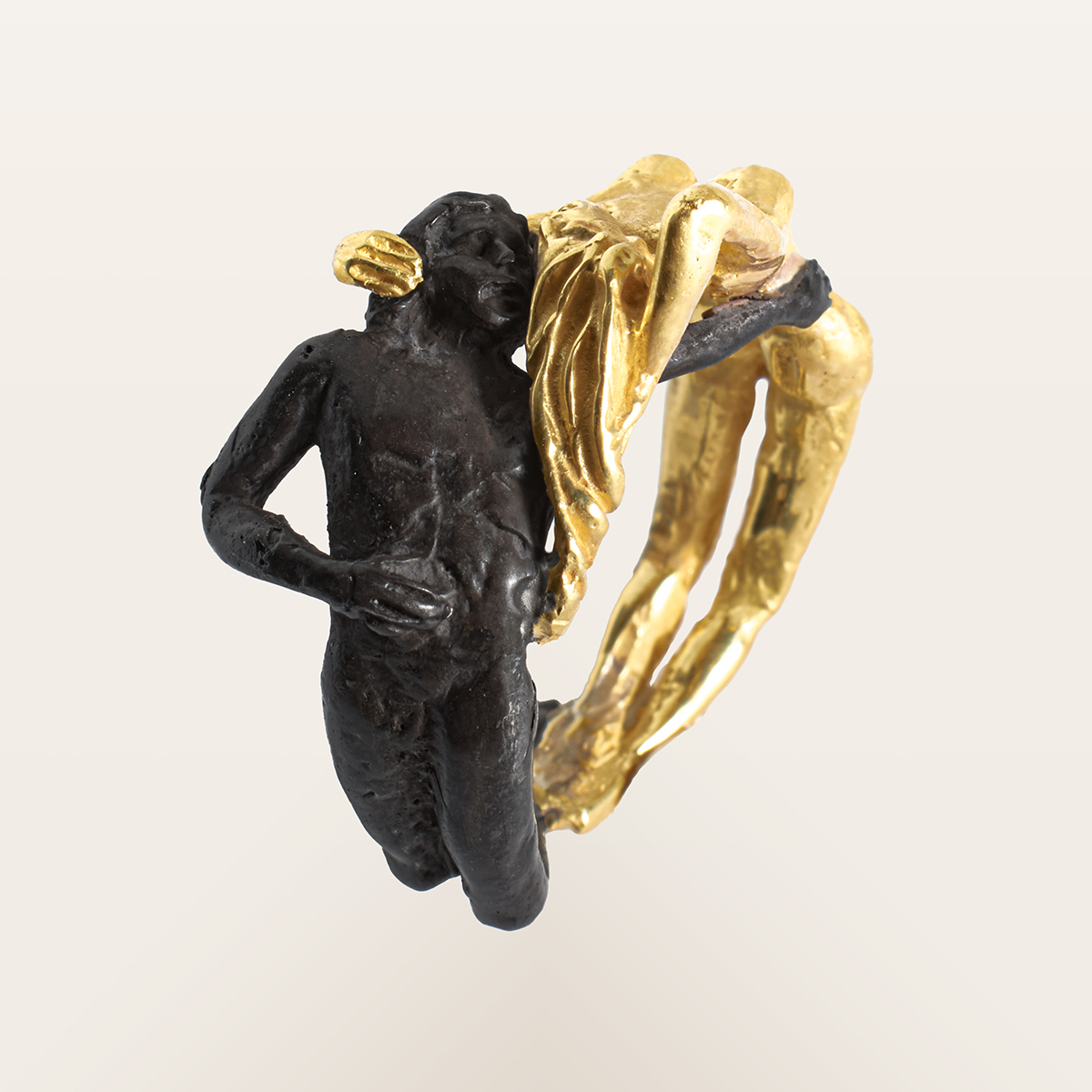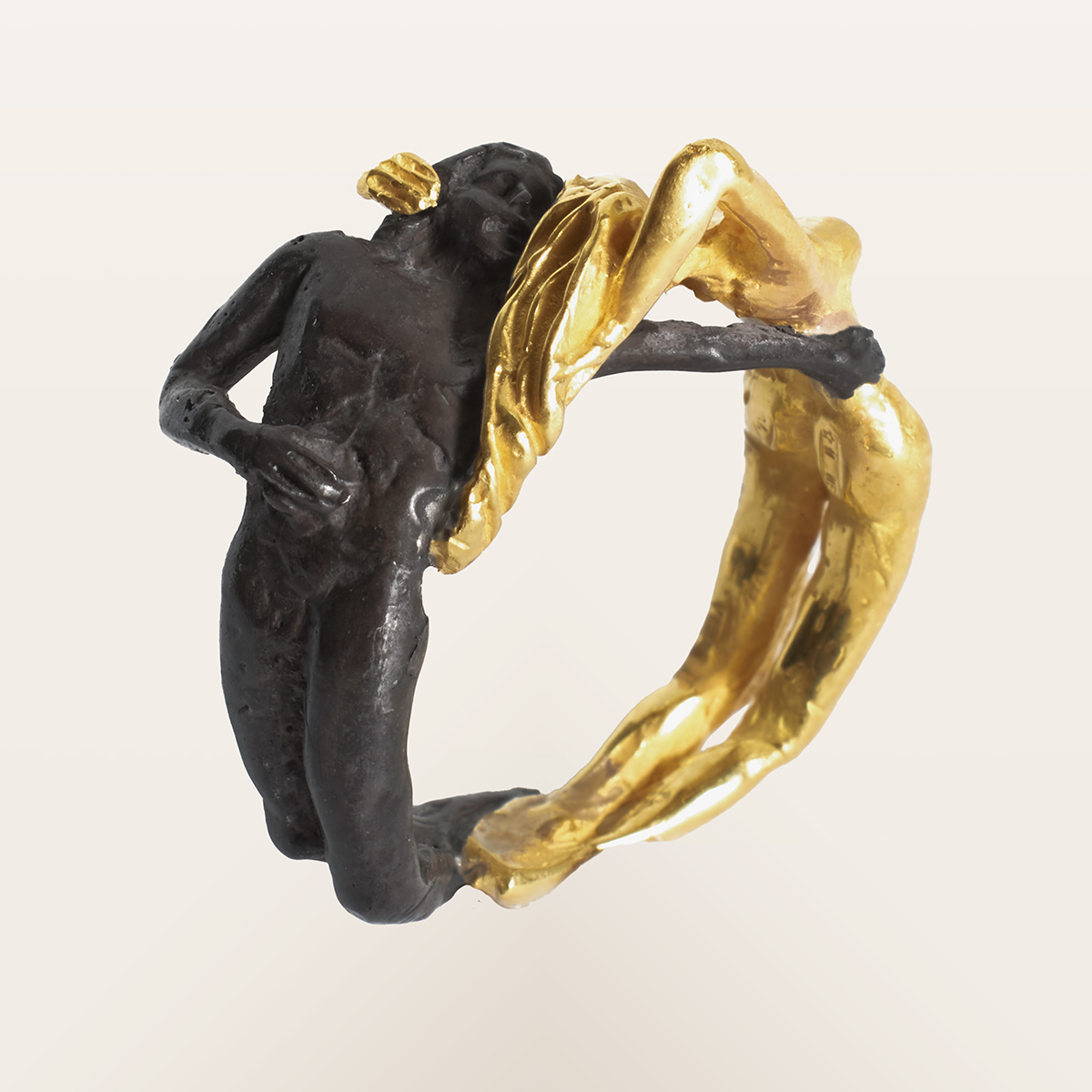 An eternal kiss, suspended between gold and silver that brush against each other without ever merging. This ring, a small sculpture to wear, captures the instant when two figures meet in a delicate embrace. A piece of jewelry that encapsulates the preciousness of a unique moment, to be experienced every day with elegance and meaning.