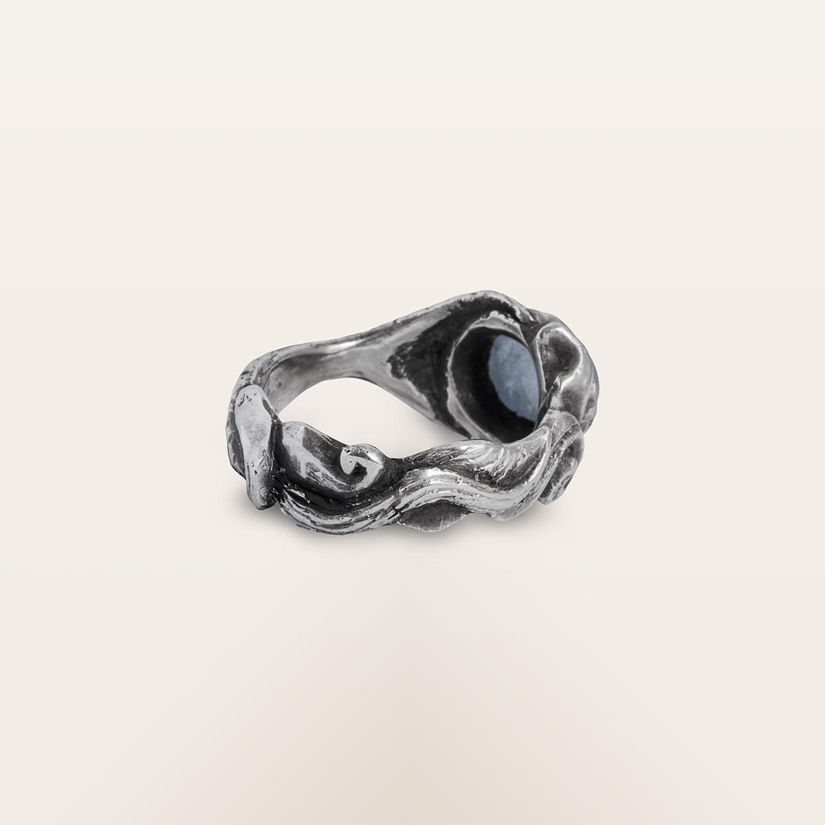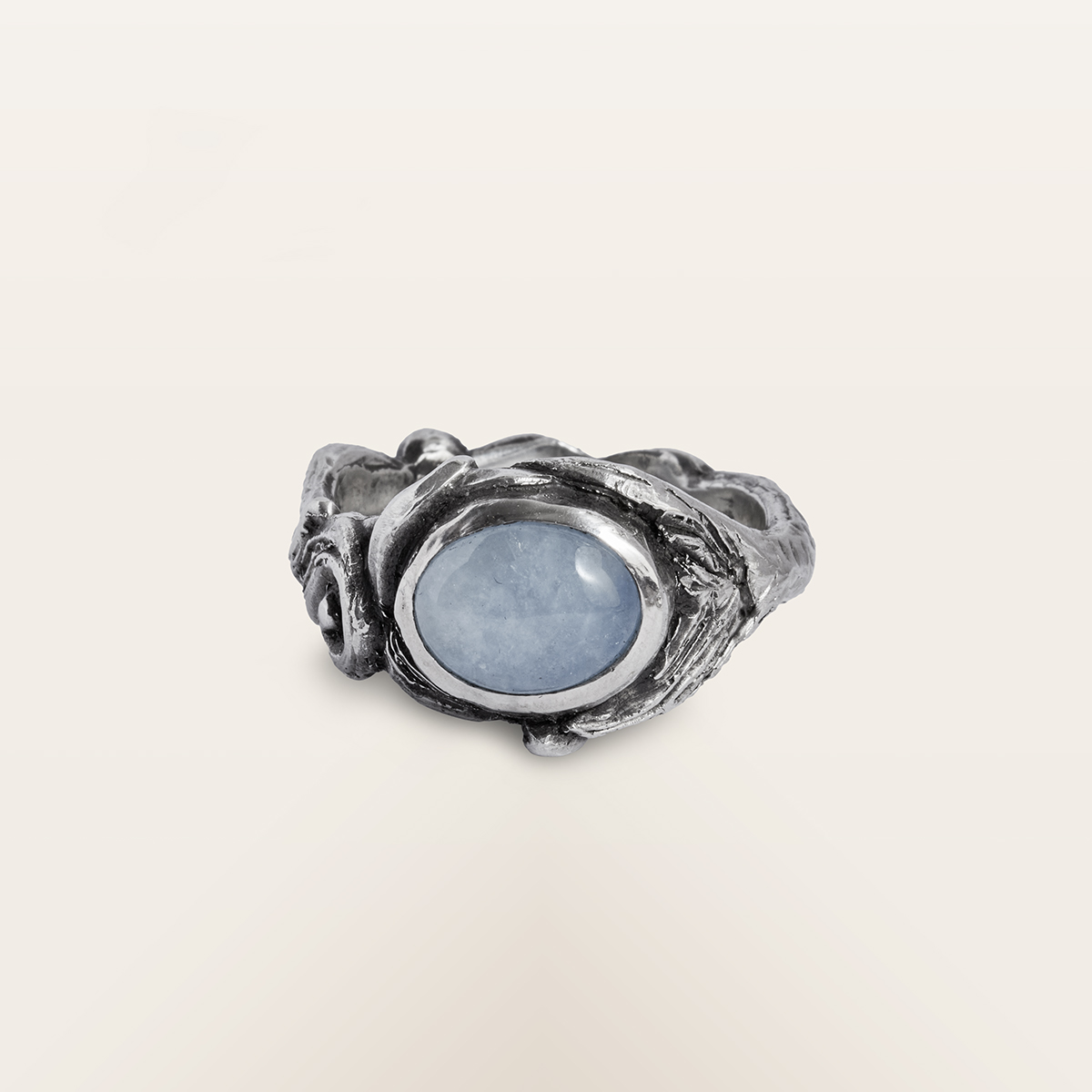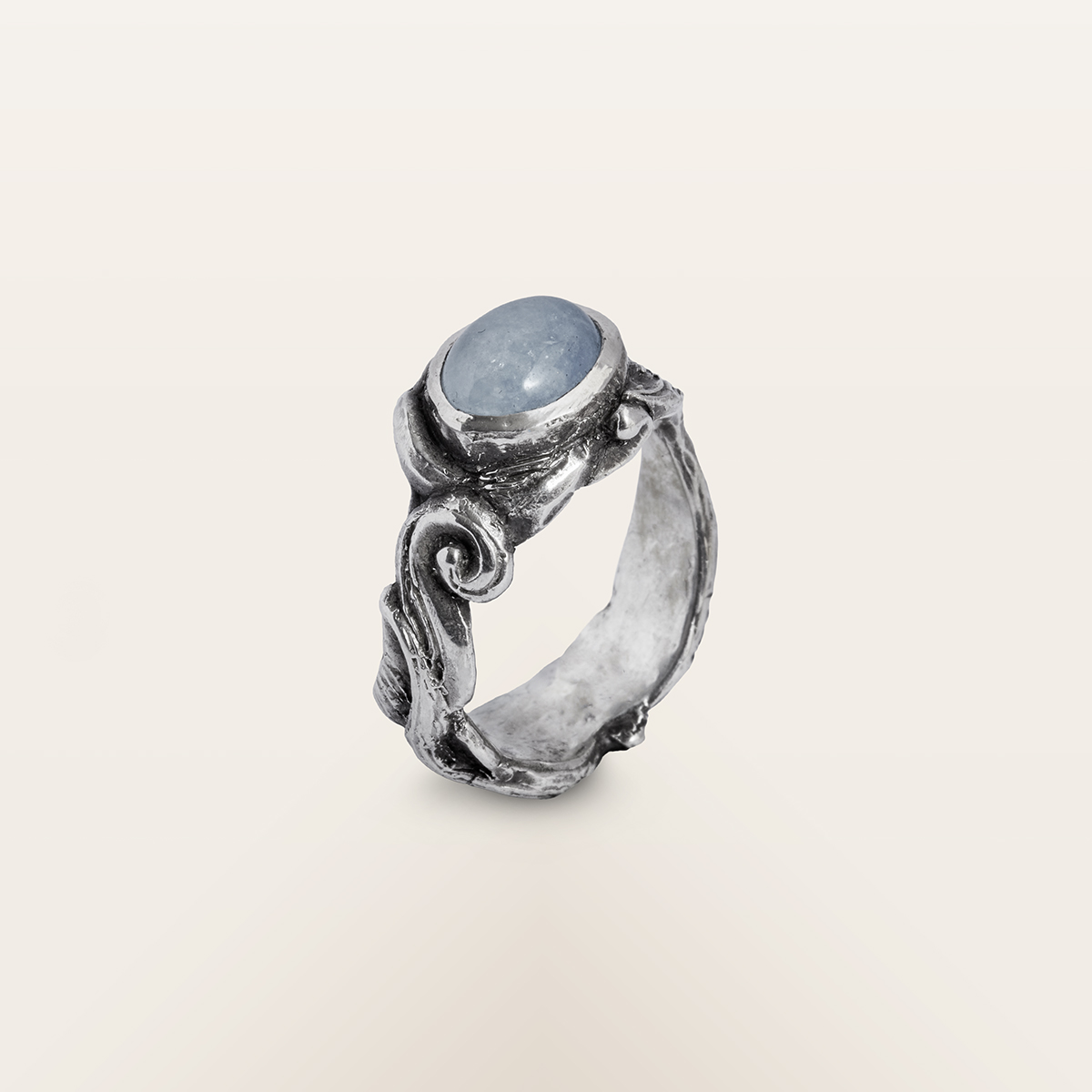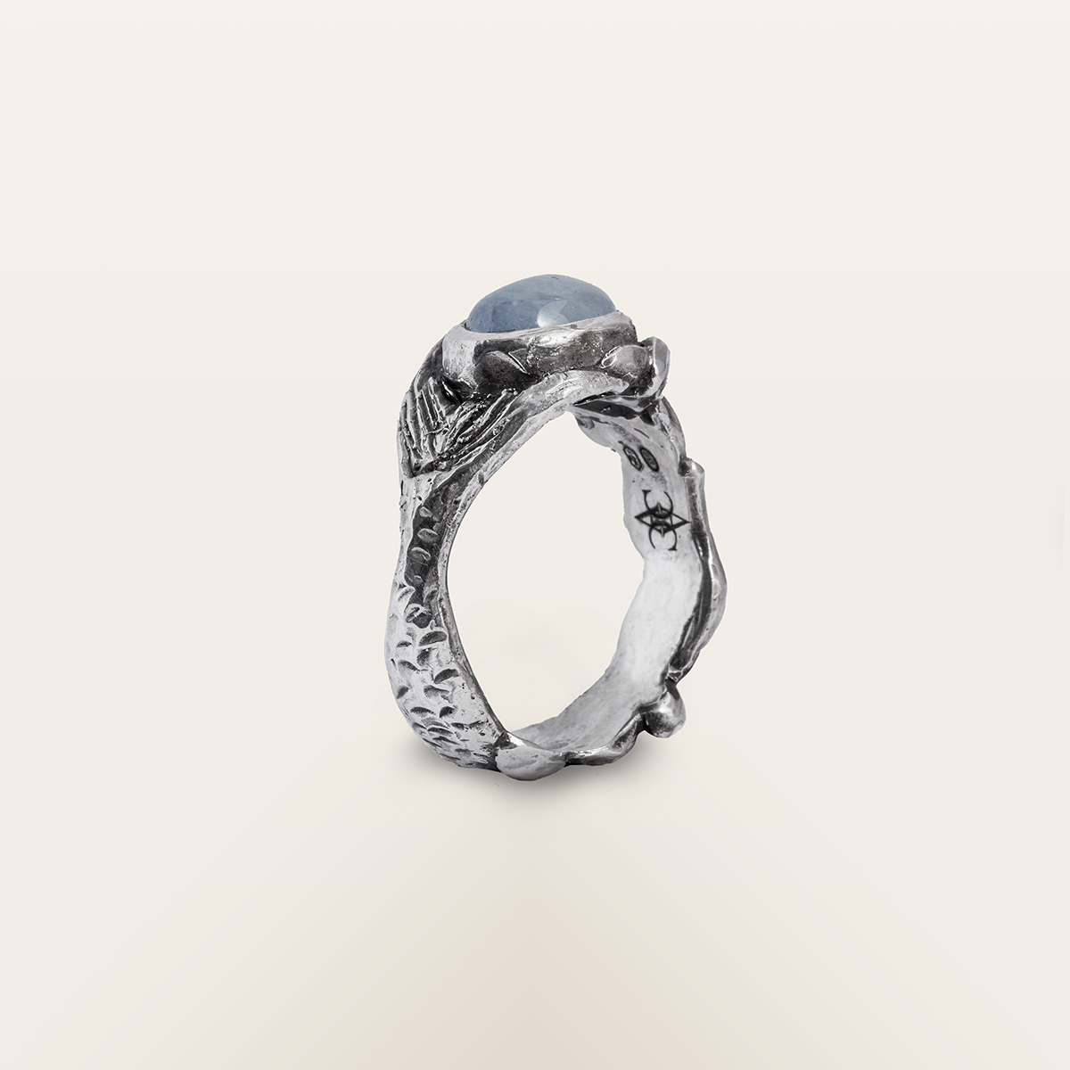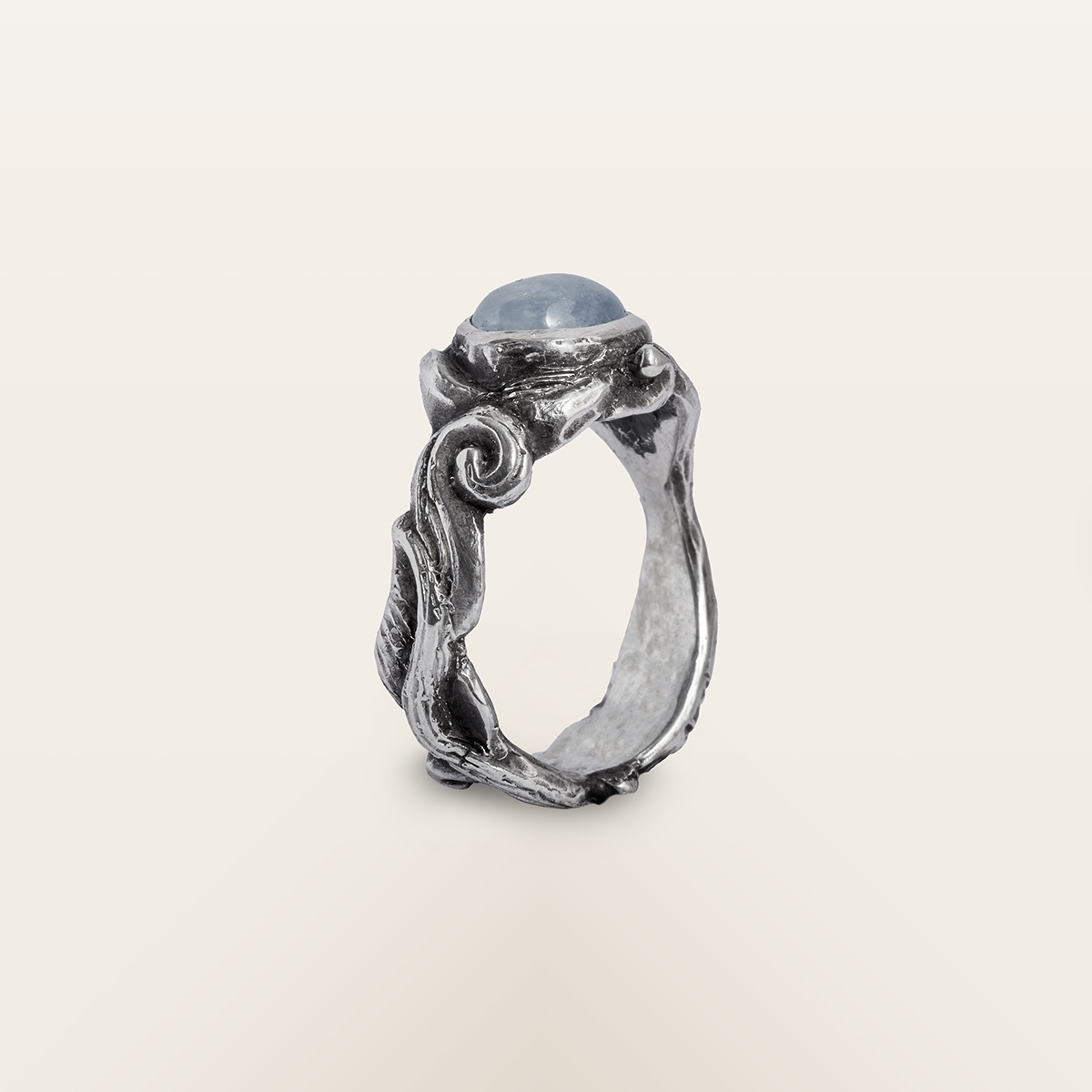 A 925 sterling silver ring in which a mermaid dives into the waves, showing only her tail. This sculptural ring, embellished with an oval aquamarine cabochon, recalls the incessant movement of the sea and its mysteries. A jewel made by hand, with artisanal care, for those seeking authenticity in the details.