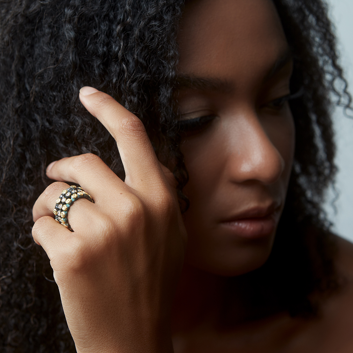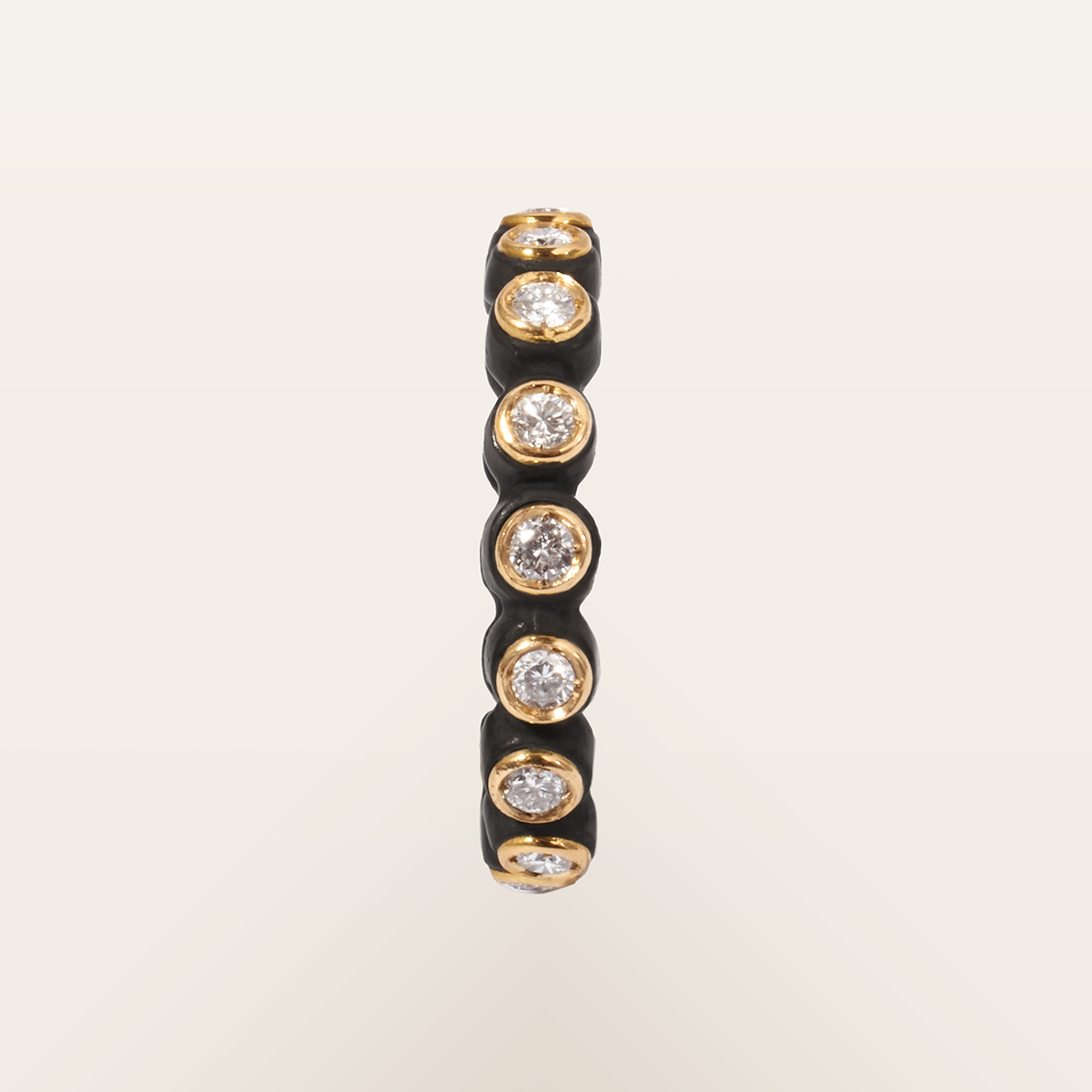 Bright with diamonds and gold, this band ring consists of a thin, comfortable-to-wear shank of oxidized silver; a succession of round bezels, soft in shape, to which gold settings with diamonds in the center are soldered at the top.