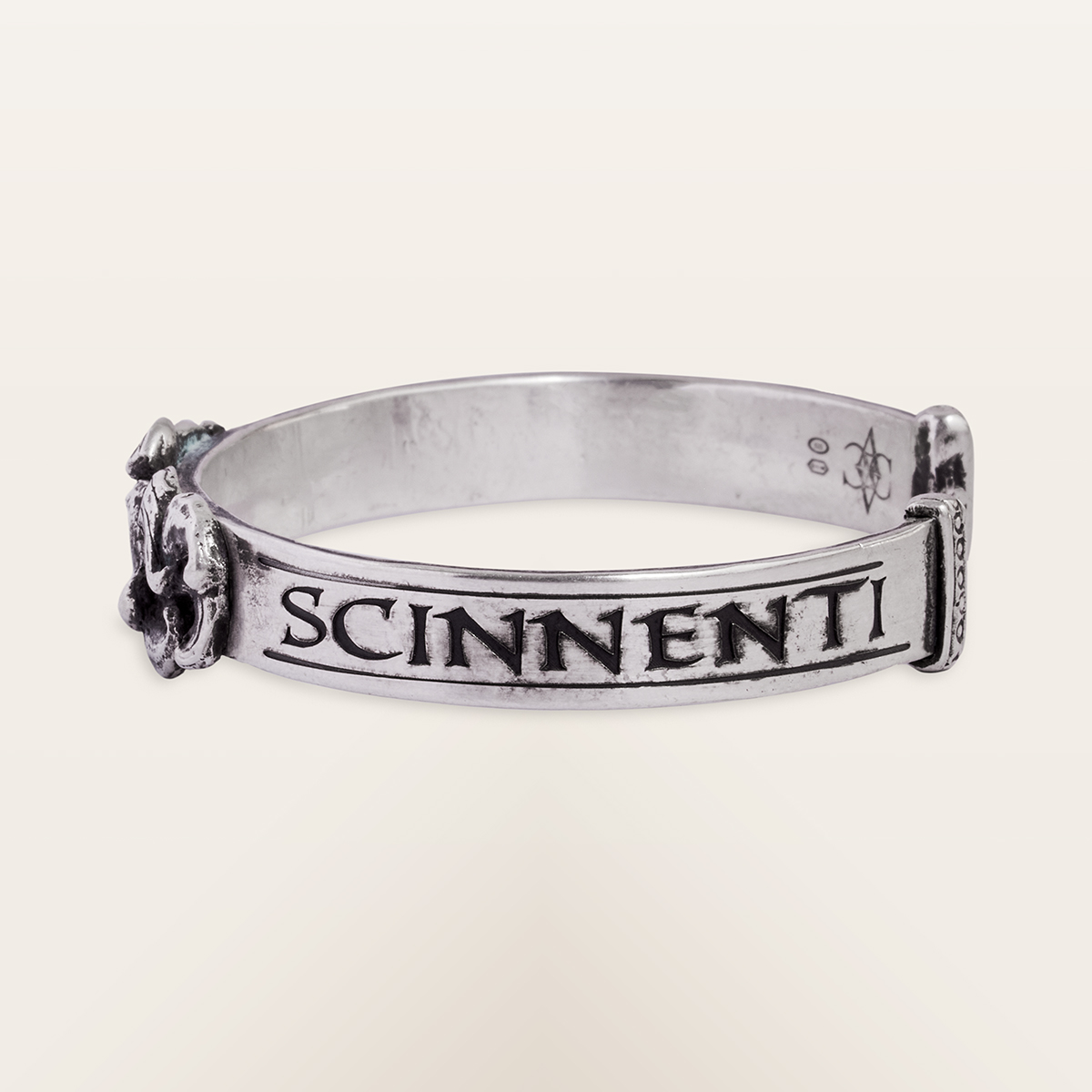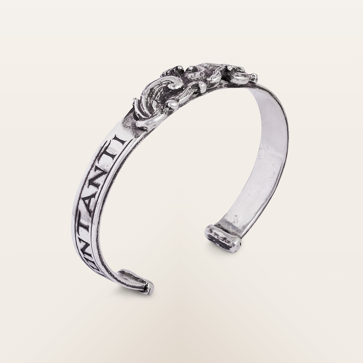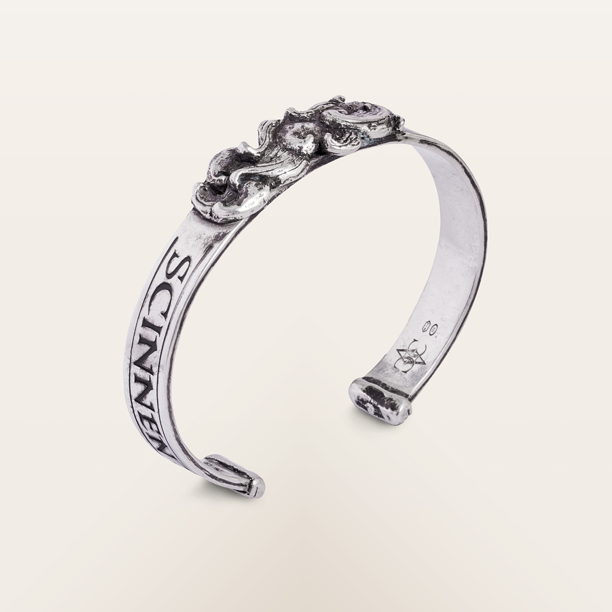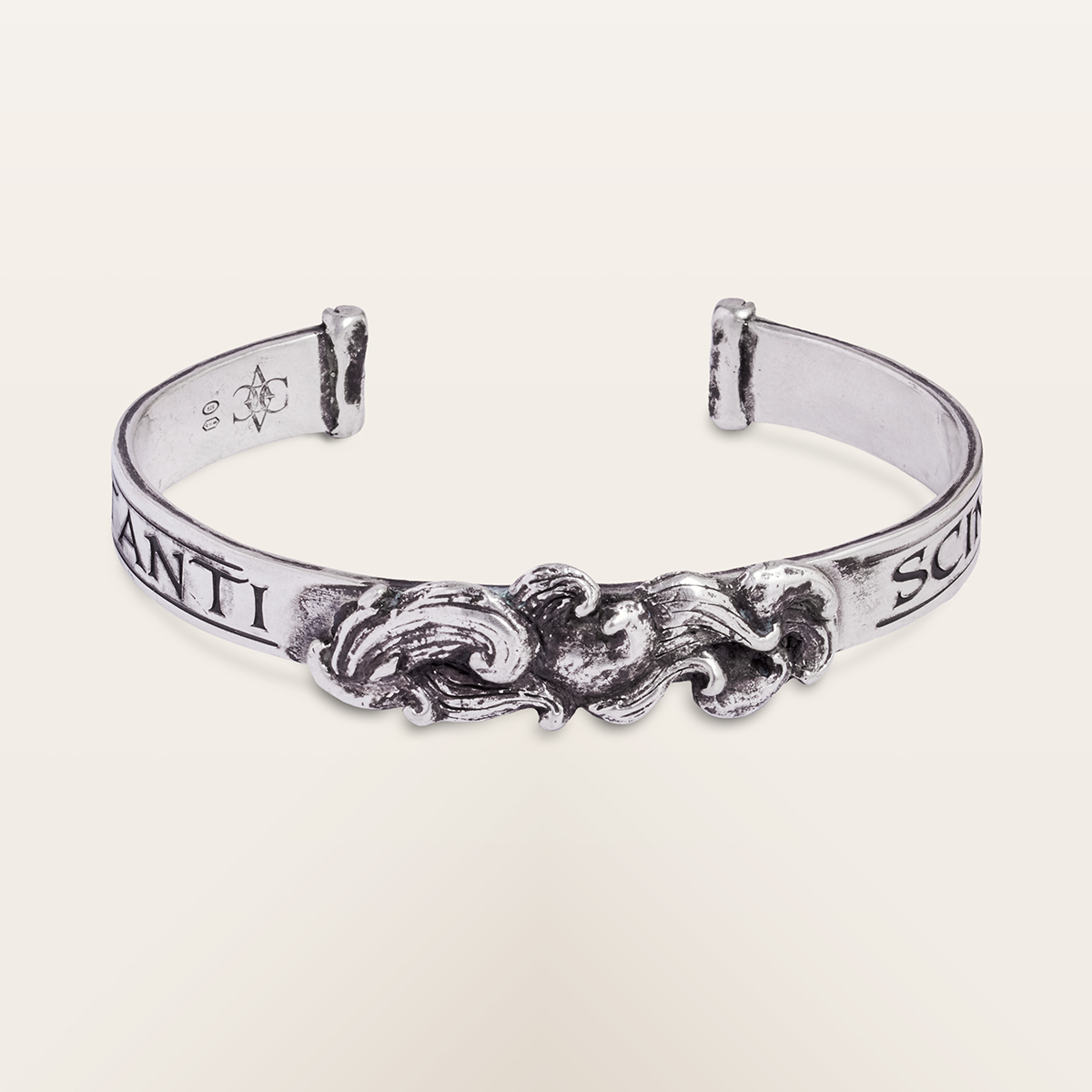 This rigid 925 sterling silver bracelet is decorated with swirling waves that recall the incessant movement of the sea. In this version, the side inscriptions bear the names of the currents alternating in the Strait of Messina. The natural flaws left by the crafting process and the shading created by the oxidation of the metal highlight its artisanal character, while the open shape makes it comfortable and adjustable. An elegant and essential piece of jewellery, designed for those seeking an original detail that blends simplicity and style.